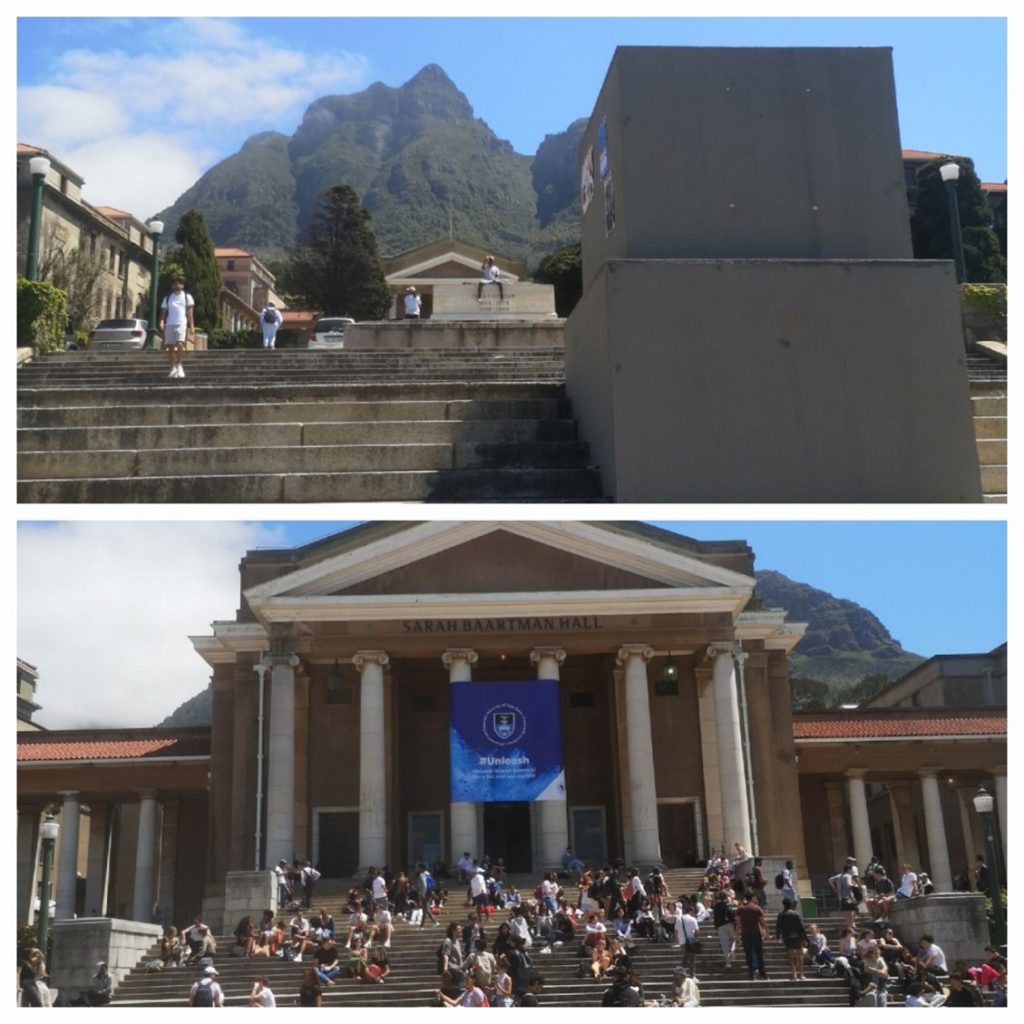 (Above: Old pedestal without Cecil Rhodes statue at UCT Upper Campus ©D.M. Natermann; below: Sarah Baartman Hall ©D.M. Natermann)