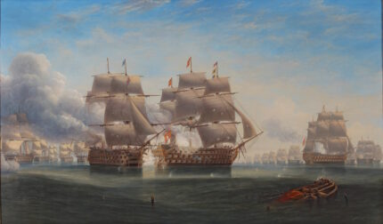 The Battle of Trafalgar took place on October 21, 1805, when the outnumbered British fleet under the command of then Vice-Admiral Horatio Nelson defeated the combined fleet of Napoleonic France and Spain. Commanded by Admiral Collingwood, Royal Sovereign led one of the two columns of warships with Admiral Horatio Nelson’s Victory leading the other. Royal Sovereign moved faster under the day’s light winds than Victory and quickly pulled ahead of the other British ships, raking the Spanish three-decker ship Santa Ana. Royal Sovereign and Santa Ana fought each other for almost three hours until the latter surrendered. Royal Sovereign’s foremast was heavily damaged, but the Union Jack was still flying.