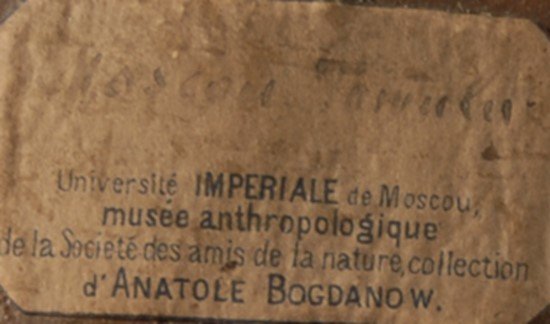 (In order to allow his colleagues to also conduct concise anthropological studies of various skulls found in the Russian empire, Bogdanov sent paper mâché copies to various European collections. This particular label is from such a copy sent by Bogdanov to Berlin, still in the collection of the BGAEU. Photo: Barbara Teßmann) Following his presentation in Paris, Bogdanov sent his replicas of his “Russian skulls” to his international colleagues, for instance to Florence where they served anthropologists’ craniological measurements.[12] Berlin also received a batch of replicas, where famous German anthropologist Rudolf Virchow praised them for their excellent quality, fidelity to the original, and manufacturing, at a 1878 Berlin meeting of the Berlin Society for Ethnology, Anthropology and Prehistory (BGAEU).[13] While Berlin received replicas, the University of Freiburg was given four original skulls from the kurgans of the Russian Empire.[14] The collection of the BGAEU does hold these skull replicas until today.